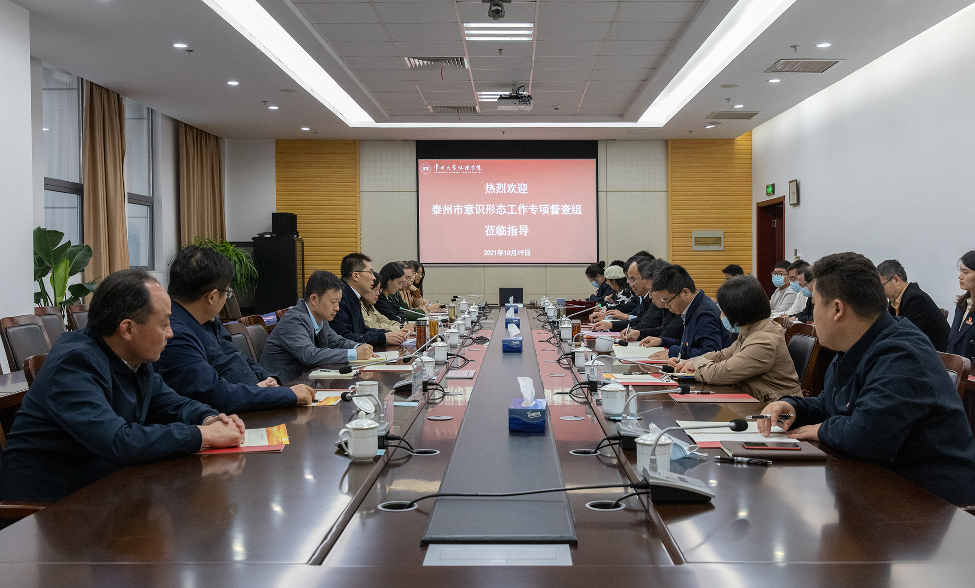 10月19日下午,以泰州市委宣传部常务副部长吉志铭为组长的泰州市意识形态工作专项督查组一行来必赢官网督查意识形态工作,院党委书记李伟明,党委副书记、副院长刘茂灿,必赢76net线路派驻必赢76net线路专职纪检委员刘育猛,副院长余海洋参加汇报会,宣传工作负责人、院团委书记、基础课部负责人、思政课教师代表、辅导员代表、学生代表及相关职能部门负责人陪同调研。